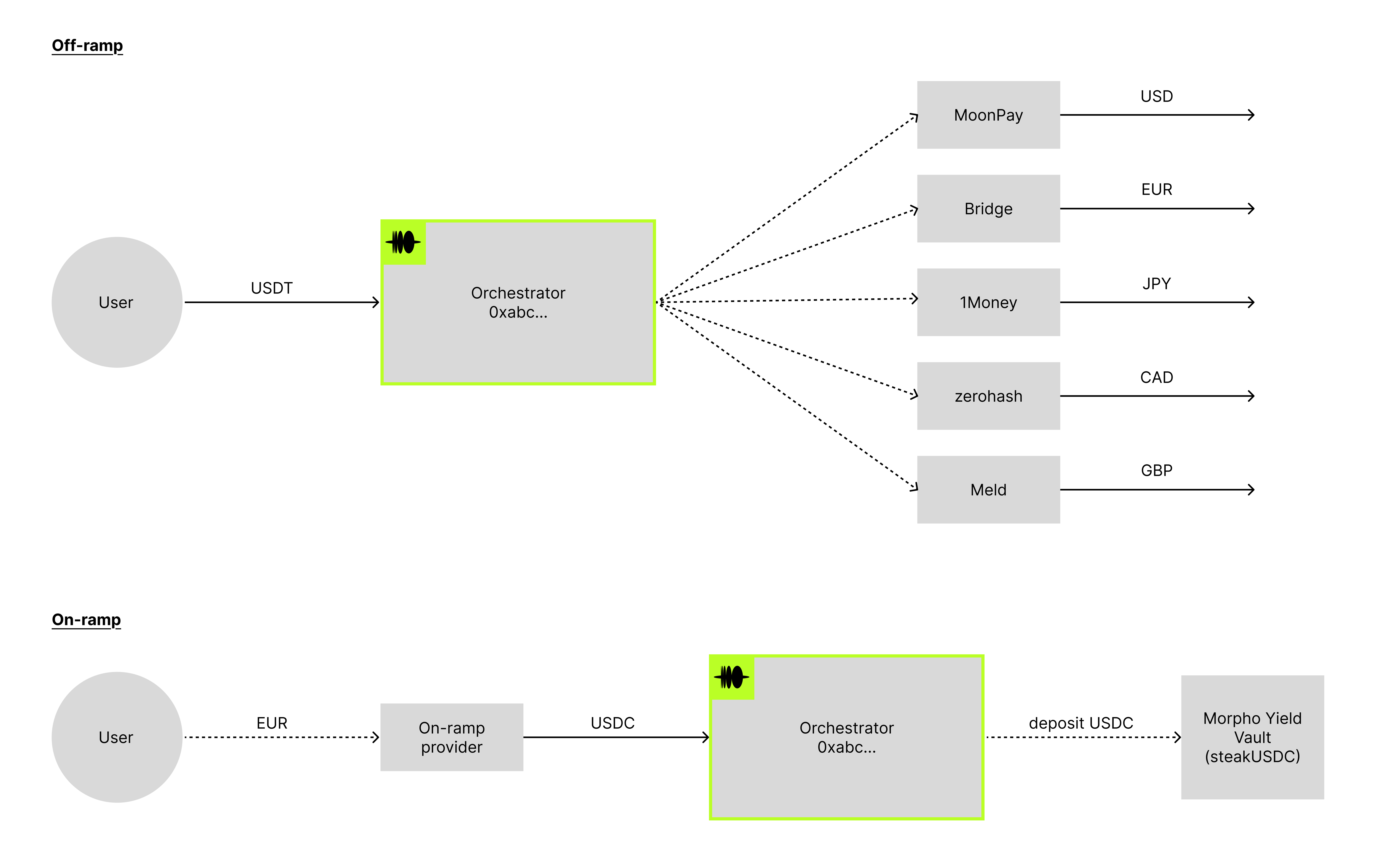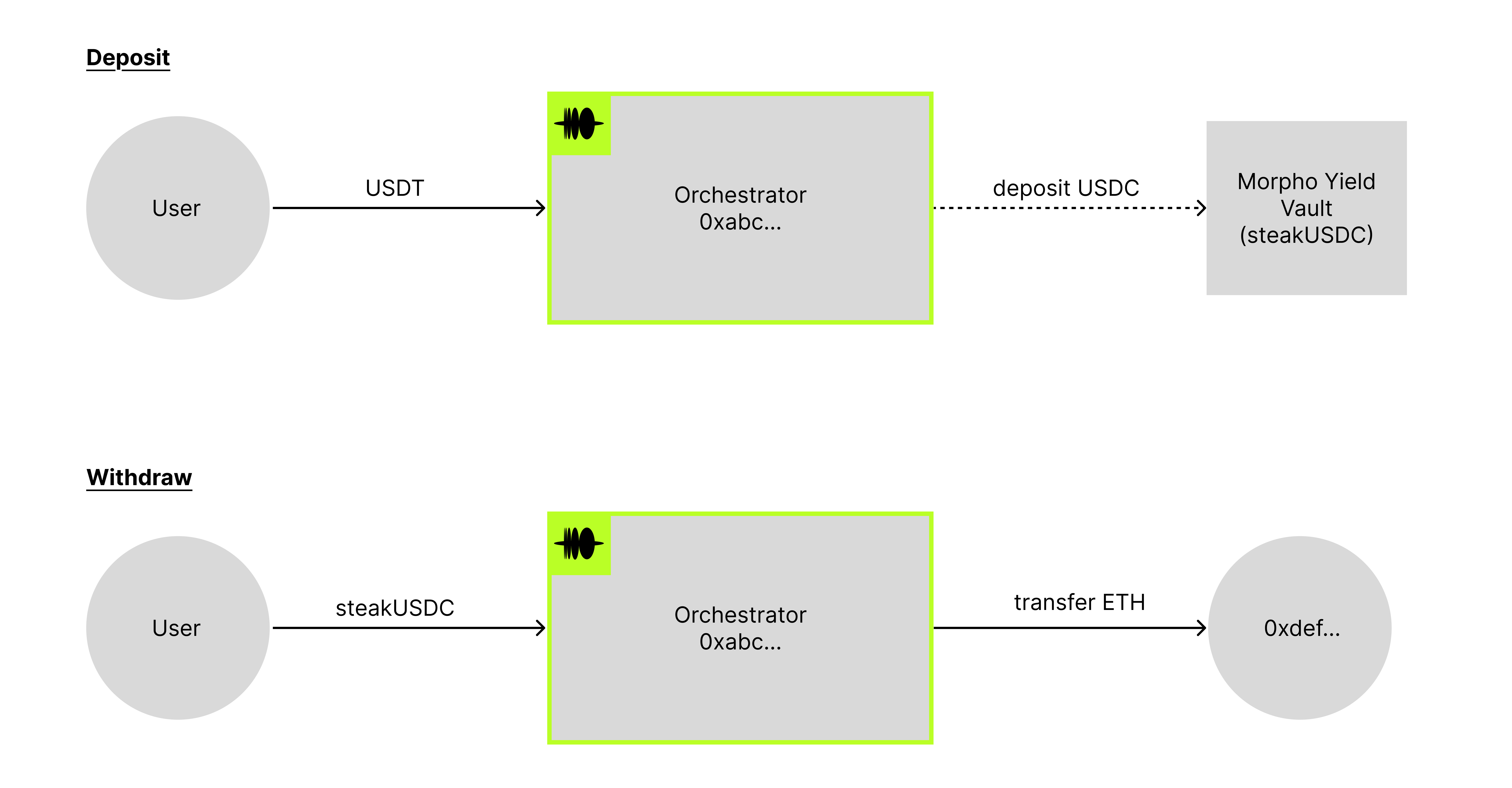 Many of today's financial platforms that have stablecoin user balances sit idle in wallets, earning nothing. With Orchestrators, you create an address that automatically routes incoming deposits into yield-generating vaults. Users send USDT but the vault only accepts USDC? The Orchestrator handles the conversion. Funds hit the address, yield starts accruing: no manual steps, no transaction babysitting.