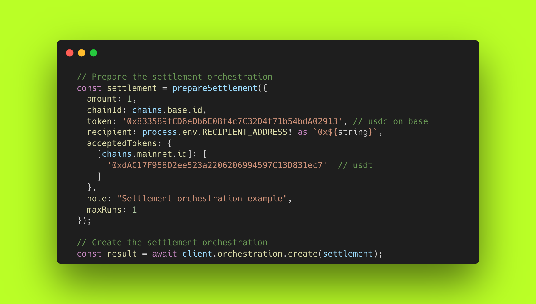 Configure them for one-time use or make them persistent. Every Orchestrator is non-custodial with trustless execution and built-in compliance.