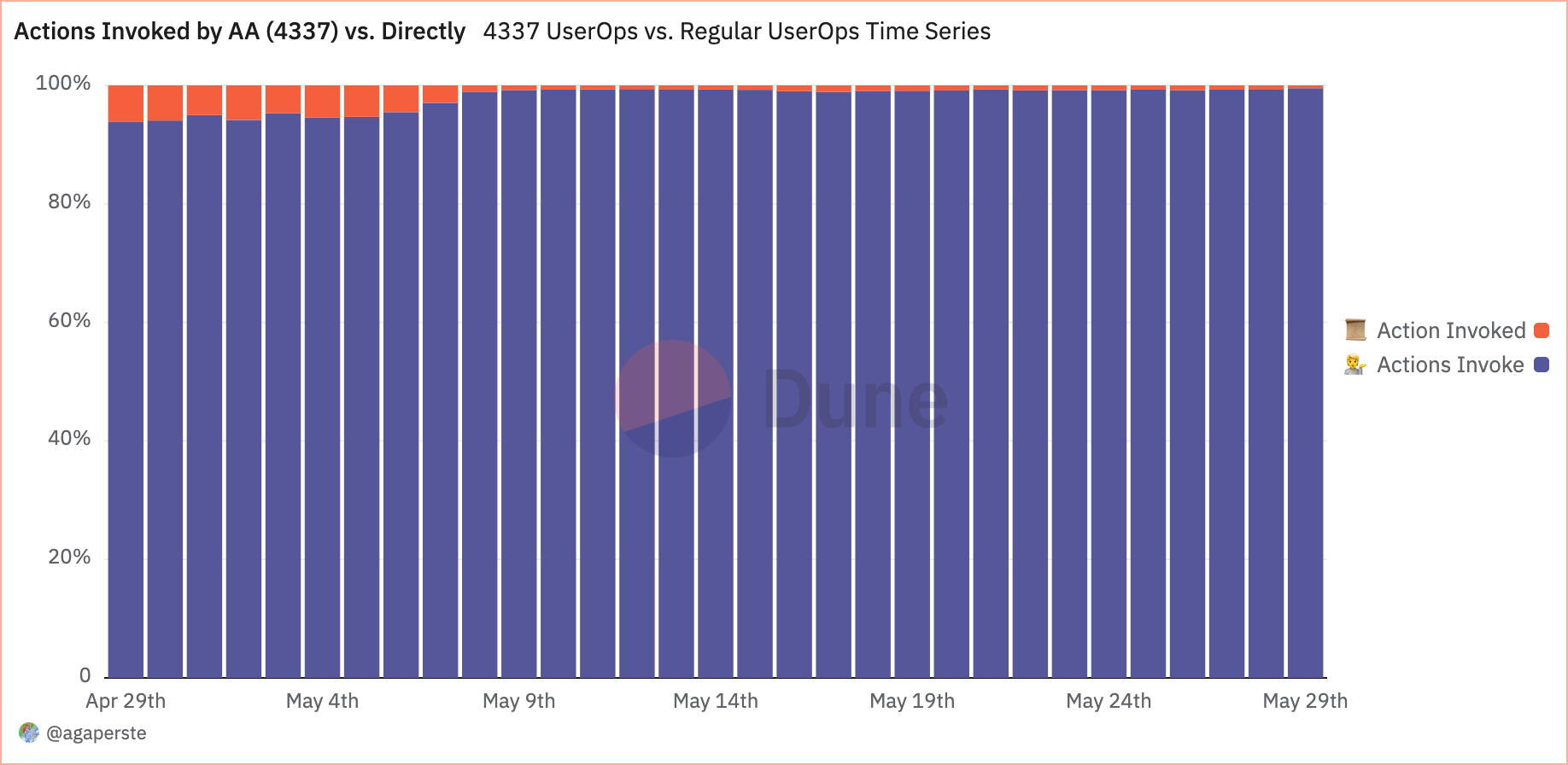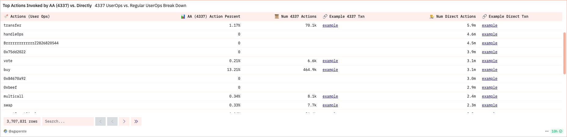Nearly all onchain value still lives in EOAs, and institutions haven’t budged from key-managed infrastructure like MPC, Secure Enclaves, and HSMs. Around 10% of user actions (i.e., transfers, swaps, etc.) on Base are invoked by 4337-based accounts vs invoked directly by EOA wallets. Boiling it down even more, only 1% of transfers and <1% of swaps are invoked by AA, with a majority still invoked by EOAs.