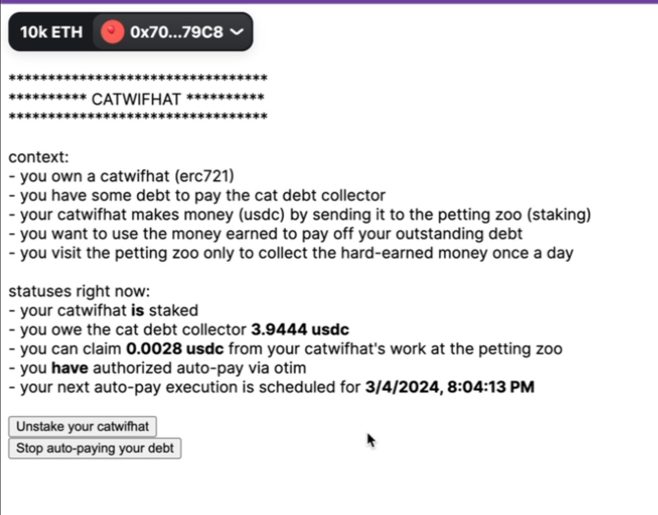 To show what was possible, we created proof-of-concept applications that brought abstract technical capabilities to life. We built a Netflix clone to demonstrate seamless recurring subscriptions, and developed "CATWIFHAT"—a playful but functional app that automated staking rewards and debt payments. These weren't just demos; they were working examples of the financial mechanics that had been impossible before account delegation.