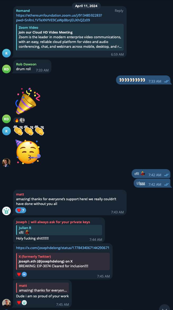 And then, on April 11th, 2024, it happened. The celebration in our group chat said it all: "BREAKING: EIP-3074 Cleared for inclusion!!!" After months of advocacy, technical contributions, and proof-of-concept building, the upgrade was officially approved.